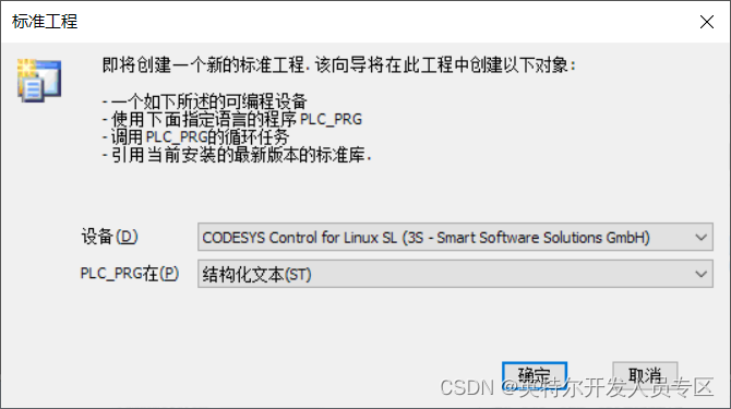 在弹出的标准工程对话框中,选择设备为CODESYS Control for Linux SL,选择结构化文本(ST)作为编程语言。