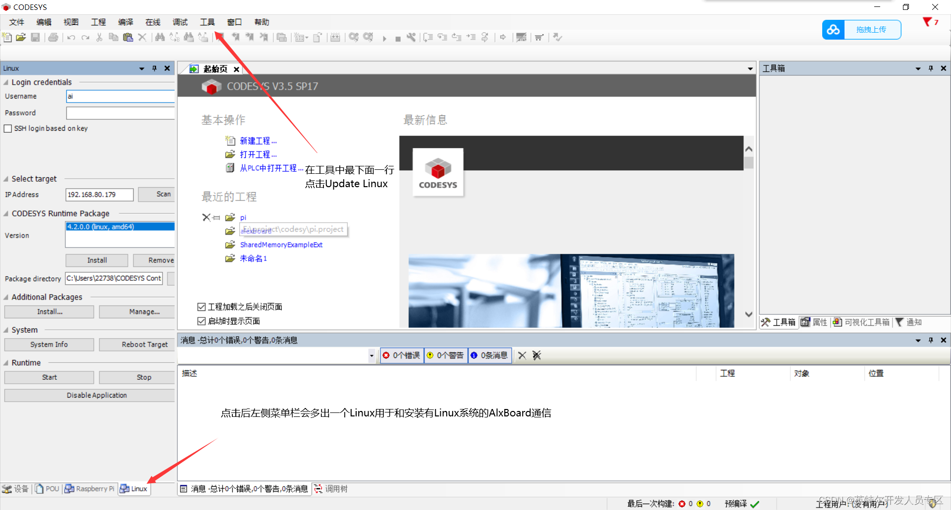 安装完成三个软件包后,重启CODESYS,随后能够在工具中最下面一行找到Update Linux,点击后会打开一个能够与安装了Linux系统的英特尔开发者套件进行通信部署的界面。