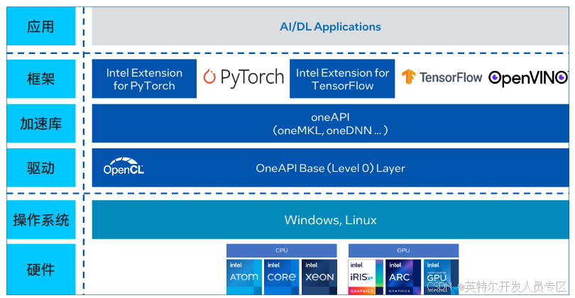 该解决方案的参考架构如图 1 所示,其底层硬件为英特尔® CPU 与英特尔® GPU,并能通过 Intel® Extension for PyTorch、Intel® Extension for TensorFlow、OpenVINO™ 工具套件与